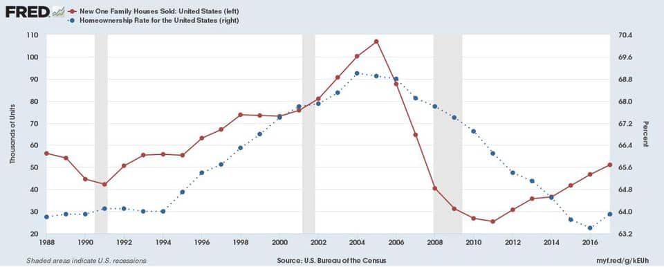 Homeownership numbers clearly show the past housing bubble and bust. An important measure of this cycle’s completion is that the proportion of people owning homes is back to a normal level. That means potential homebuyers and lenders can take this as a sign that the boom’s abnormal risk is gone.